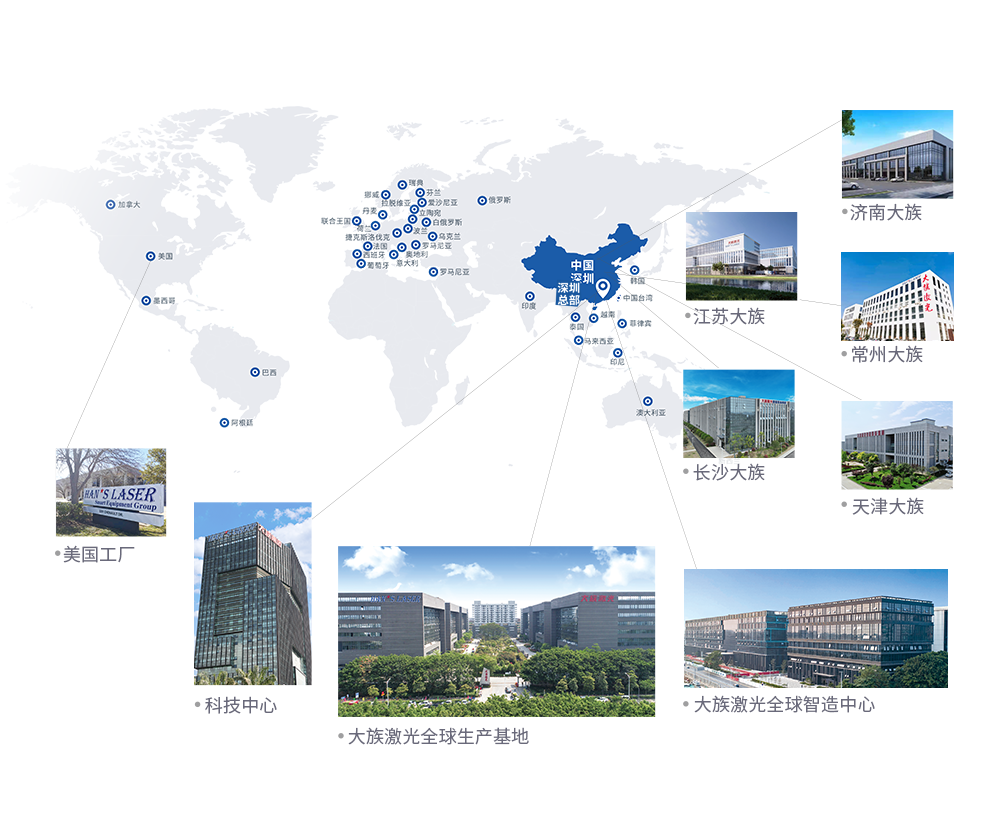 大族激光智能裝備集團作為全球具綜合性、專業性、先進性的激光智能裝備服務商,致力于中高功率激光切割、切管、折彎機及自動化生產線的研發、制造、銷售與服務,憑借深圳、張家港、常州、天津、長沙、蘇州、濟南及美國得克薩斯州等海內外生產基地和備品備件庫的堅實基礎,構建了輻射華南、華中、華東、環渤海、北美等海內外運營總部與七大銷售片區,業務覆蓋全球超過100個國家和地區,國內外180余個辦事處,為全球3萬個規模以上工業客戶提供高品質產品與優質高效服務。